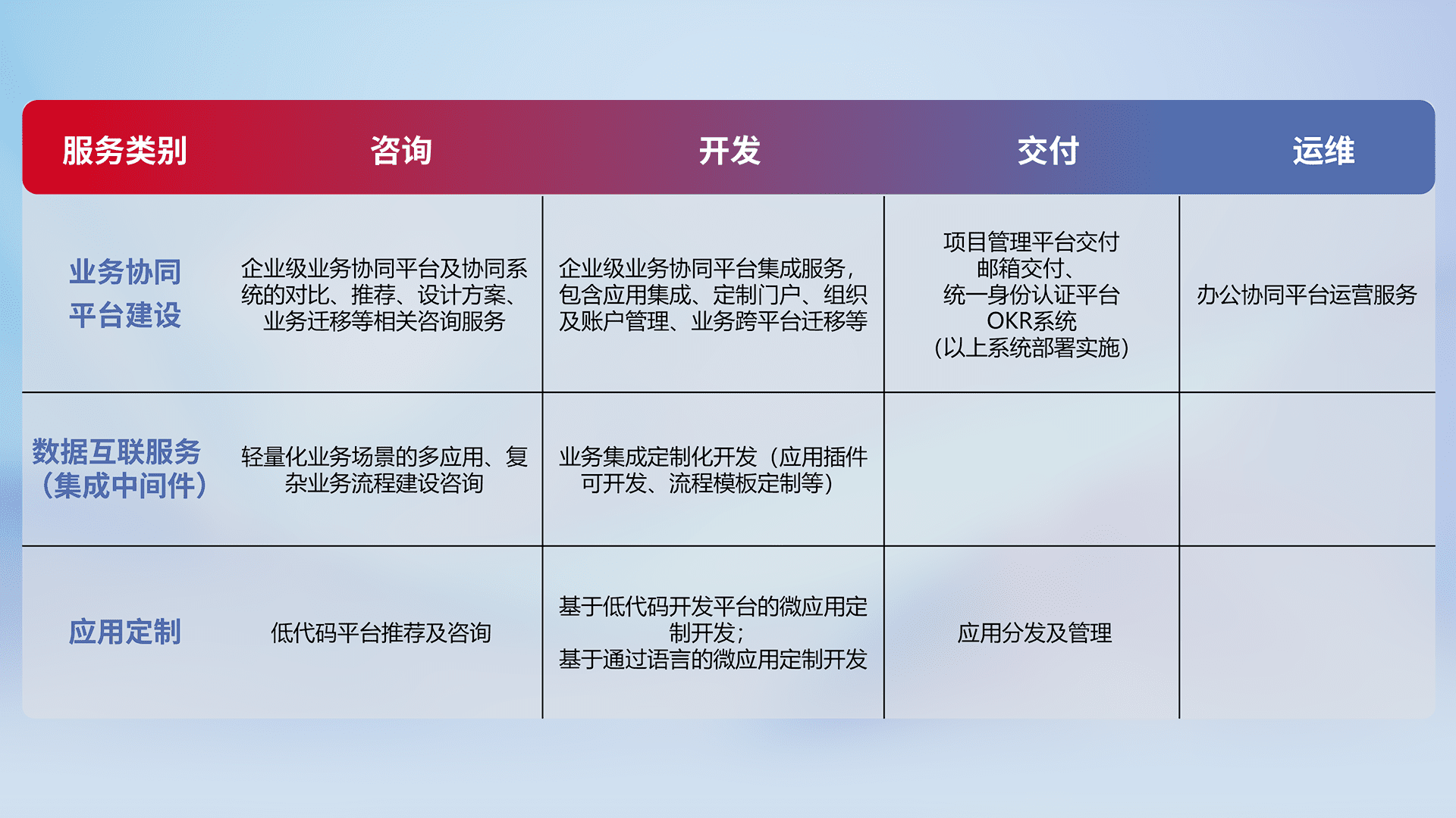 针对钉钉、、企微、、、IDaas等平台级产品提供产品的规划、、、方案、、、交付、、定制化开发等服务,,,实现如统一协同办公、、、智能客户服务、、、、混合会议管理、、、、智能数据查询、、、等业务场景,,,,实现数字化转型。。