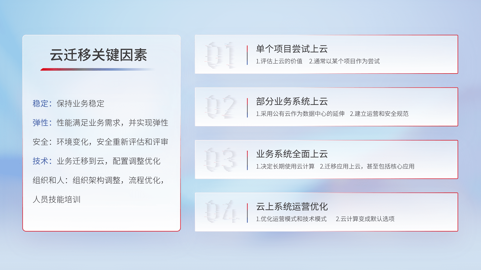 结合实际业务,,,,从规划设计、、、云平台选型、、、、云原生改造、、、数据迁移、、、、集成交付,,迁移全过程为客户识别最佳上云路径,,,做好风险识别管理,,设计网络架构、、、身份权限、、、安全审计合规、、、操作审计、、、、日志审计、、监控告警策略、、、、多站点容灾设计等,,,对云上基础设施进行整体规划,,,,提升IT治理水平,,以满足弹性、、、、高可用、、、高性能的需求。。