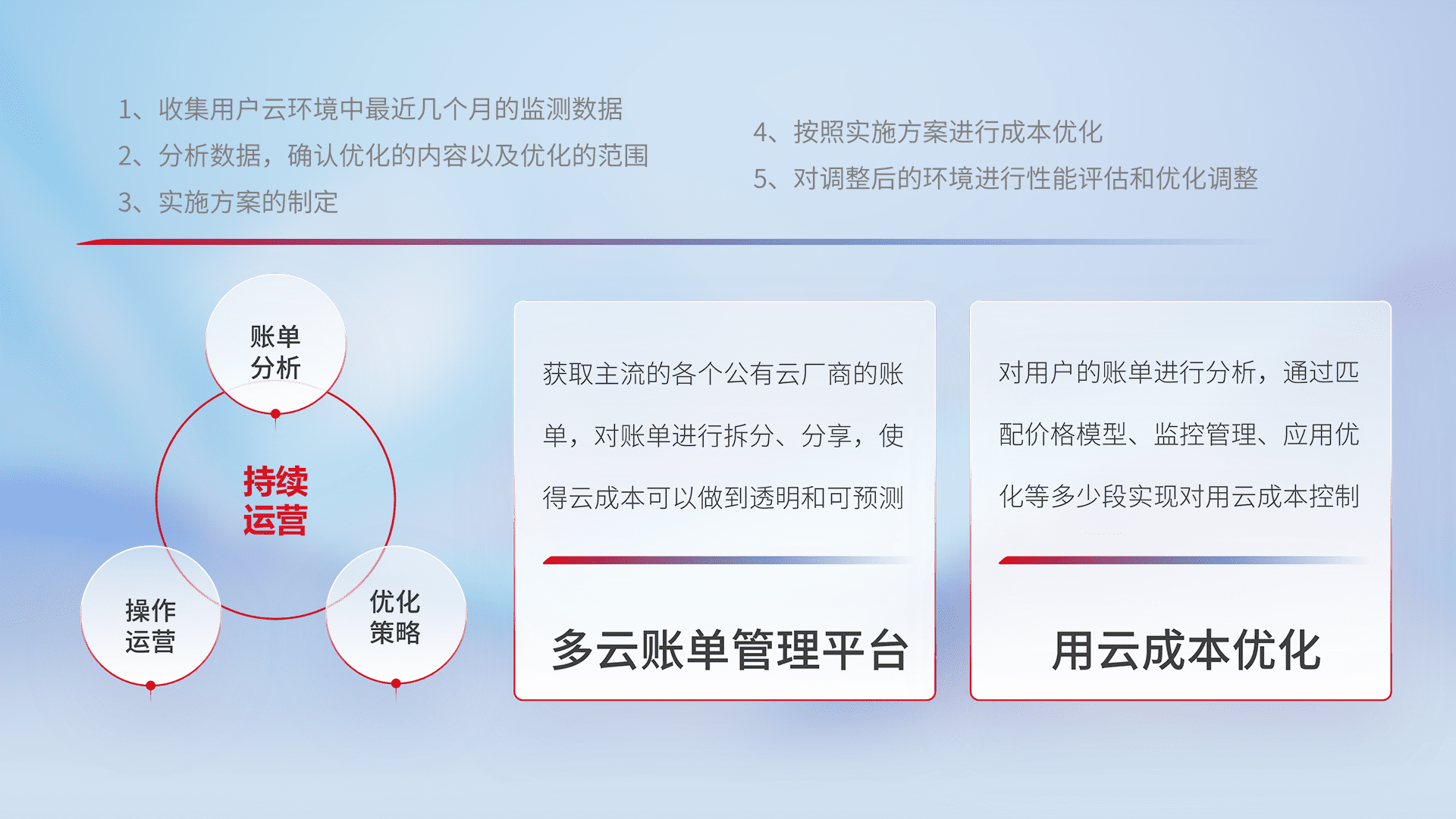 通过多云纳管,,以统一的资源数据模型把客户的云资源进行抽象和封装,,,进而实现对多云资源的统一操作,,保障云资源管理的可靠性、、、、稳定性与可用性。。。。量身定制化运维内容,,,,配置、、、、开发运维、、、、补丁管理、、、备份、、监控、、、认证和访问管理、、、审计和日常巡检等,,,,保障在用云过程中的可靠度,,,稳定度以及高可用率。。。